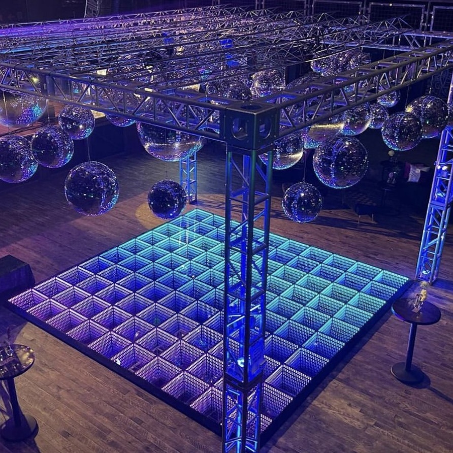 Complete your event design with a custom vinyl dance floor wrap from Ross Productions. Whether you’re hosting a luxury wedding, a corporate gala, or a themed celebration, our team can transform any dance floor into a stunning visual centerpiece. Each wrap is made to enhance your event’s look, featuring elegant monograms, clean branding, or vibrant, full-color designs that leave a lasting impression.